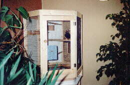 1990 (August) Nach einigen Wochen stellte sich heraus, dass die im Juli 1990 gebaute Voliere extrem schwierig zu reinigen ist (besonders der Zimmerbrunnen). Weiterhin wurden alle Pflanzen (bis auf Yukka) von Hubert zerstoert. Der Anlass eine neue Behausung zu bauen, bei der die Pflanzen von aussen angebracht sind |